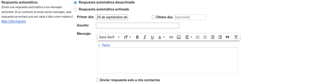 He configurat la resposta automàtica, que serveix per enviar un missatge predefinit de manera automàtica cada vegada que es rep un correu electrònic.