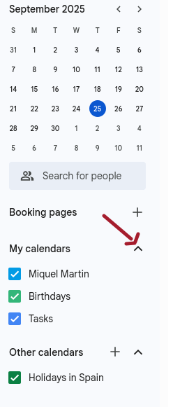 A la barra lateral esquerra veuràs la llista dels teus calendaris, fes clic sobre el calendari personal que vols compartir.