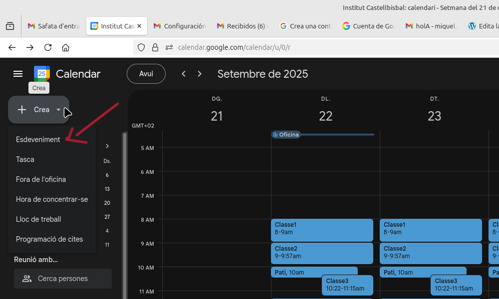 Accedeix al teu compte de Google i obre l’aplicació Calendar, després fes clic al botó “Crear”.