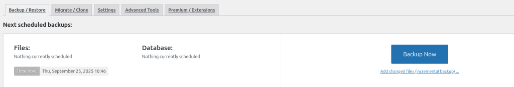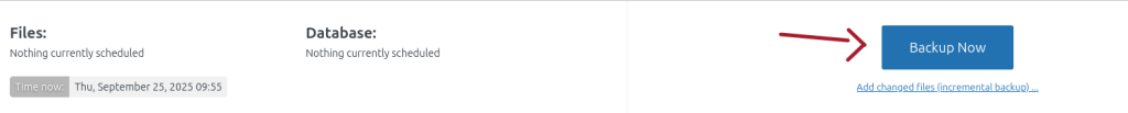 Fes clic a “Backup Now” per iniciar immediatament la creació de la còpia de seguretat del teu lloc web.