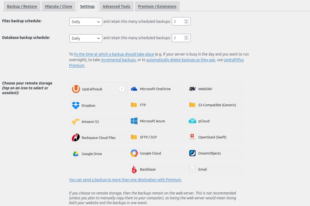 Aquí pots definir cada quant temps es faran les còpies de seguretat, tant de la base de dades com dels fitxers (diàriament, setmanalment, mensualment, etc.), i també indicar quantes còpies vols conservar alhora, per exemple mantenir només les dues més recents.