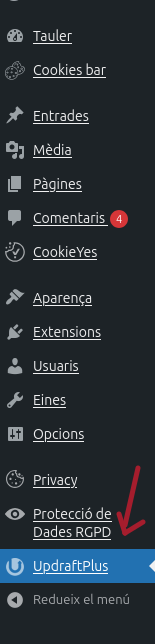 Un cop activat el plugin, anem al menú lateral i fem clic a “Backup Now” per iniciar la còpia de seguretat.