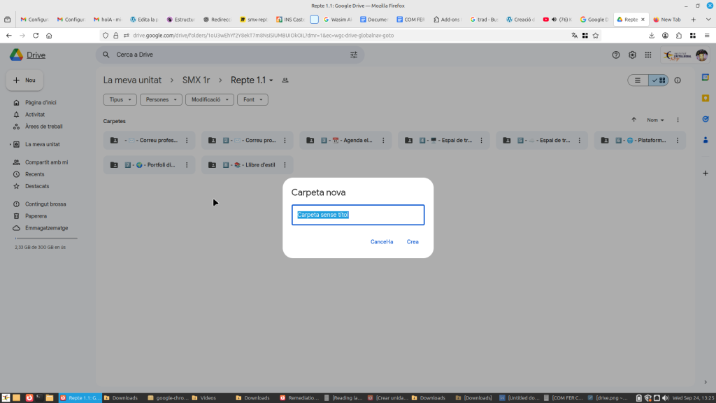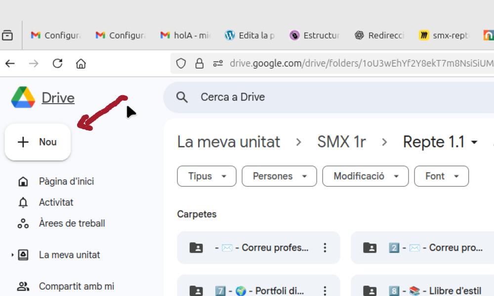 Vaig organitzar el meu Drive amb carpetes seguint una estructura clara. He creat una carpeta principal anomenada “SMX 1r” i a dins hi he posat subcarpetes per a cada repte: “Repte 0”, “Repte 1”, i així successivament. Dins de cada repte hi he afegit històries com “Correu corporatiu” i “Correu professional”, i finalment, a l’interior de cada història hi tinc els apartats corresponents.
