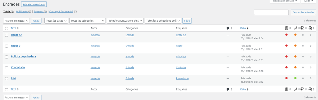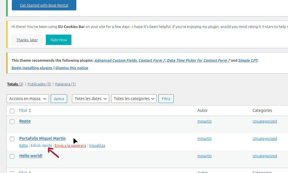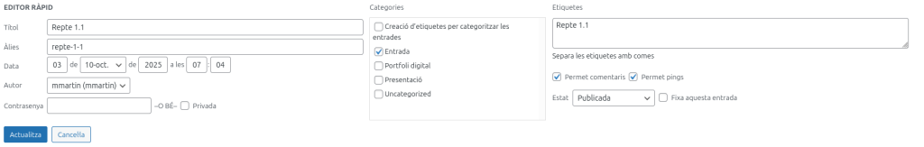 Un cop dins l’apartat «Entrades», triem l’entrada que volem categoritzar i etiquetar i fem clic a «Edició ràpida».