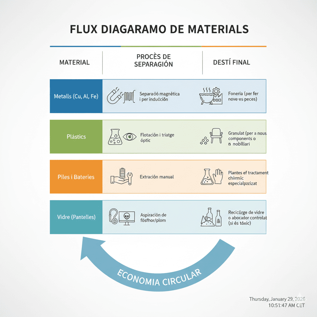 • Reciclatge i Valorització: Es tritura la resta per separar el coure, l’alumini, el ferro i el plàstic per tornar-los a posar al mercat (Economia Circular).