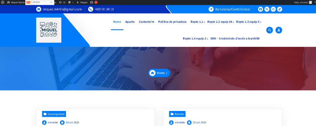 He organitzat el menú de manera que el més important es vegi primer. He posat iPOP!, Apunts i els reptes que portem fins ara ,al principi perquè és el que més faran servir la gent que visti la meva pagina i així no perden temps buscant. A la part de els reptes, he creat un menú desplegable per posar-hi tots els ‘Reptes’. Així la barra de dalt no queda súper plena i la pantalla es veu més neta. Per acabar, he deixat les Polítiques al final de tot; hi són perquè per llei (RGPD) han de sortir, però no fan molèstia mentre estàs estudiant.
